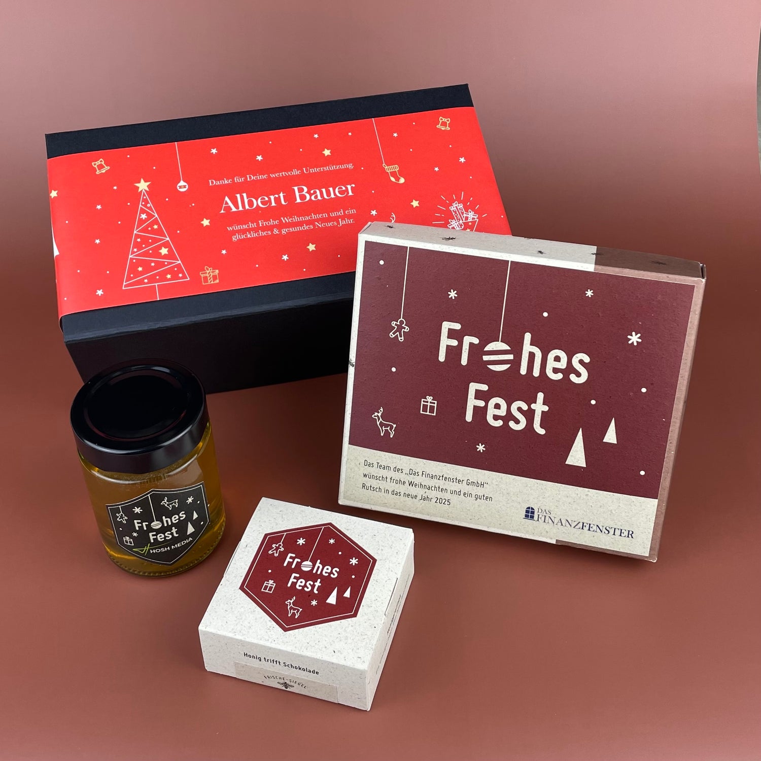 Unsere Honigpralinen Schachtel in der Weihnachtsedition.