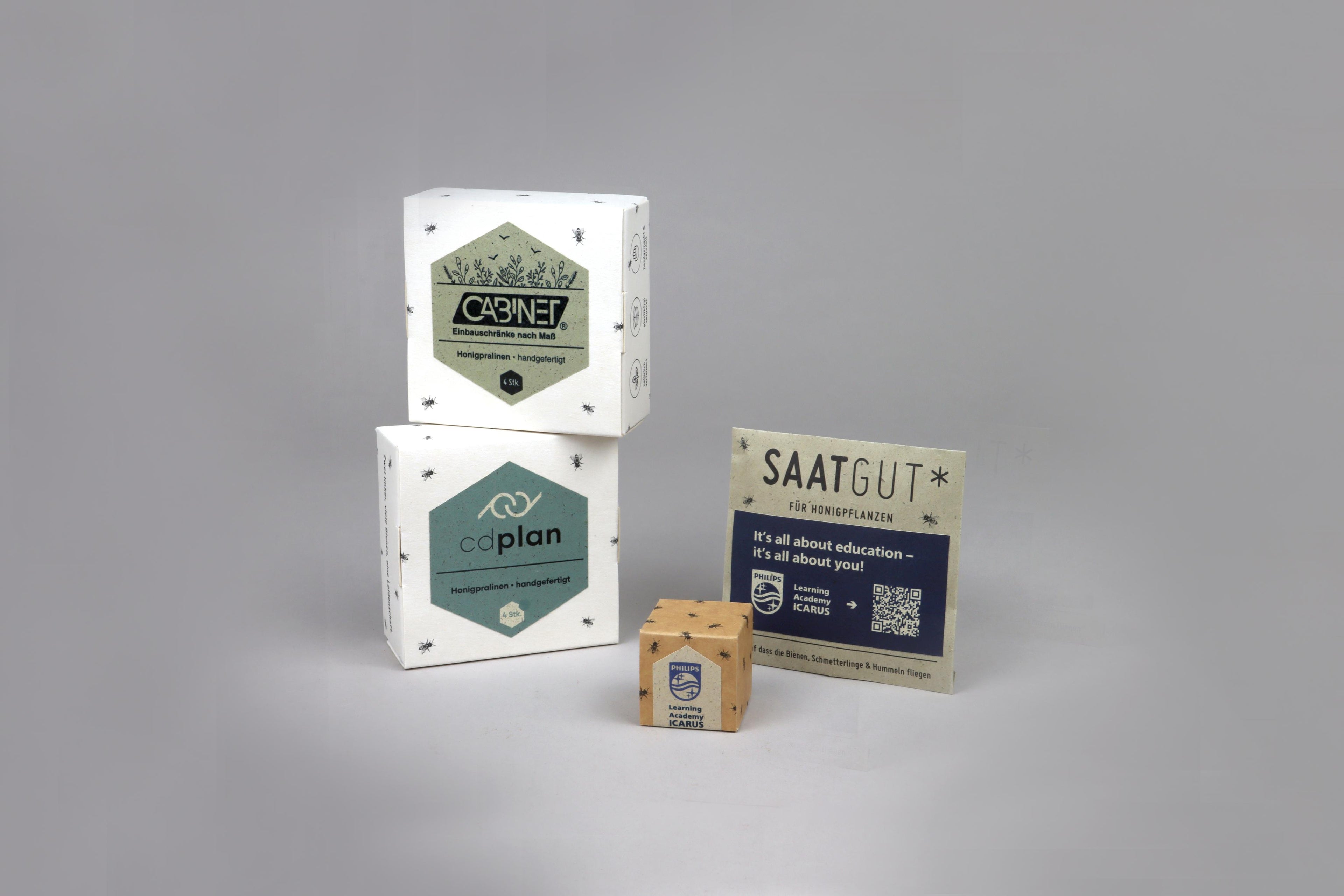Wir individualisieren in unserer Grafikabteilung schon ab kleiner Auflage 1er, 4er und 9er Honigpralinen, Honig, Saatgut & die Banderolen unserer Geschenkboxen.